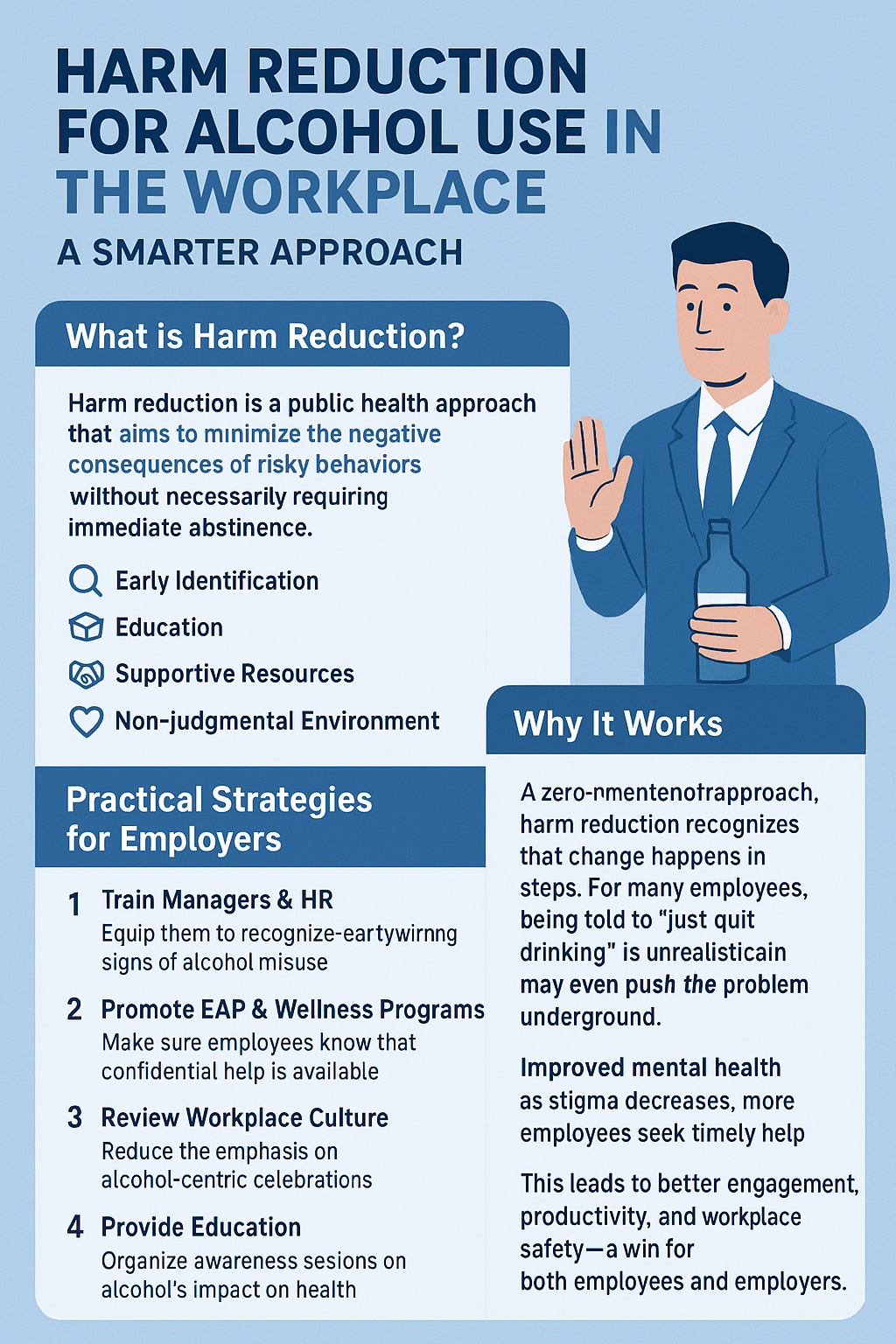 Harm reduction in the workplace is a compassionate strategy that focuses on minimizing the negative effects of alcohol use or other risky behaviors. Instead of strict punishment, employees are offered support, counseling, and wellness resources.